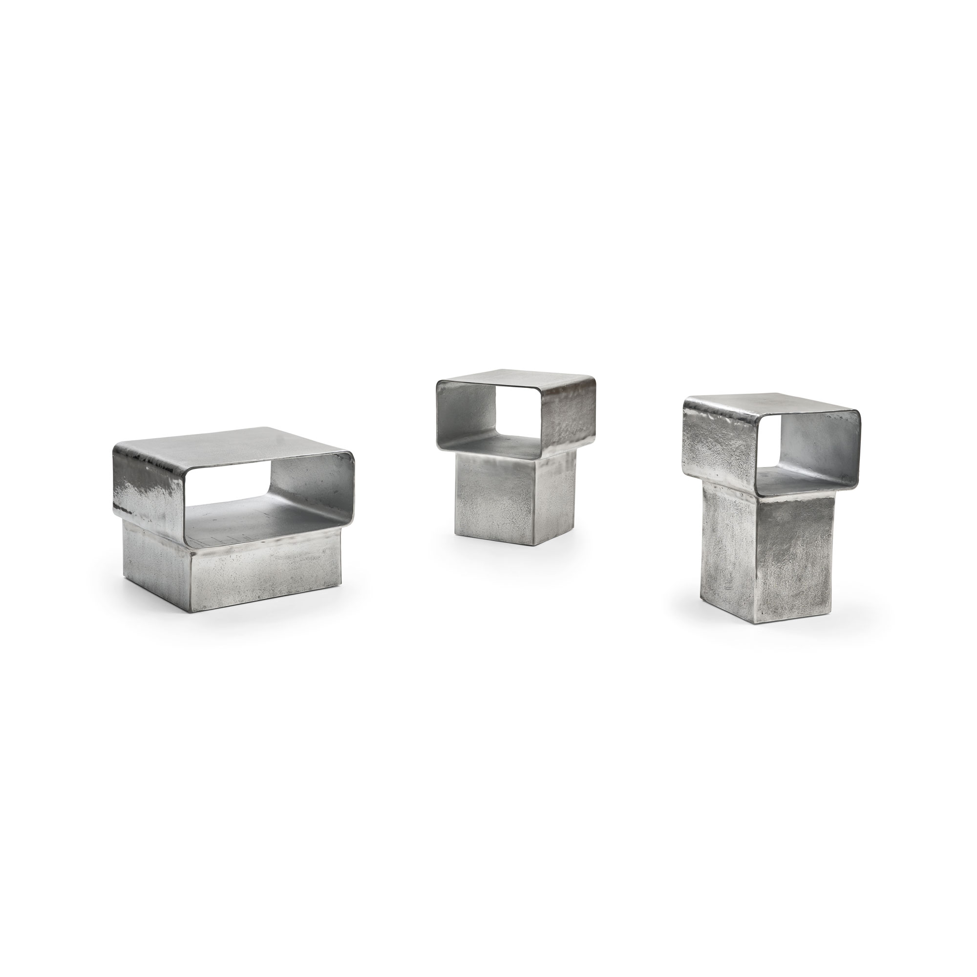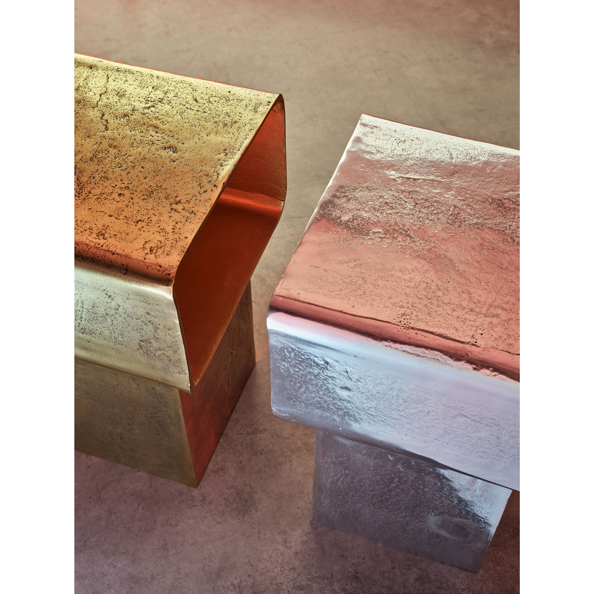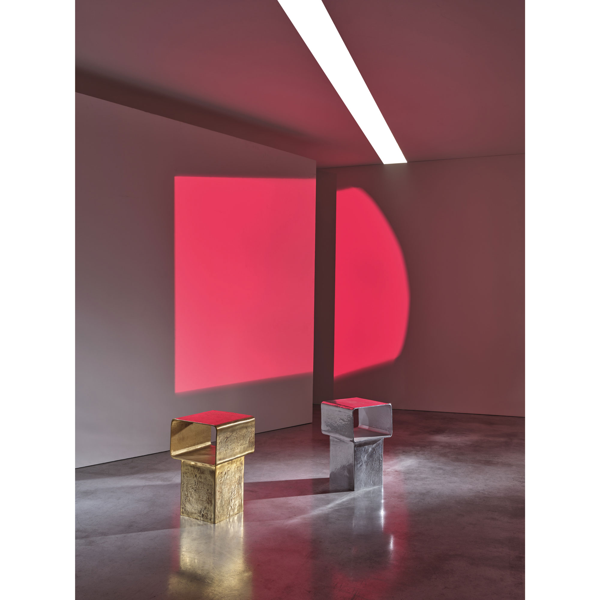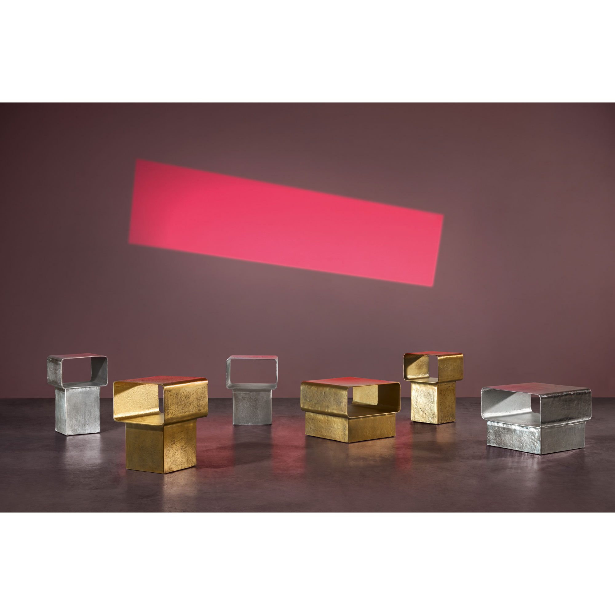 The Kira side table stands out for its bold design, defined by a play of solid and void volumes. Made from cast aluminum, it features clean geometry, with a cubic base and a square top with rounded corners. The Gold or Chrome finishes enhance its sparkling, industrial aesthetic.