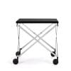 Variants: Variably height-adjustable side table oncasters. Frame steel, powder-coated in blackor chrome-plated. Tabletop crystal glass,black lacquered or Fenix HPL in matte black.Plastic casters in black.