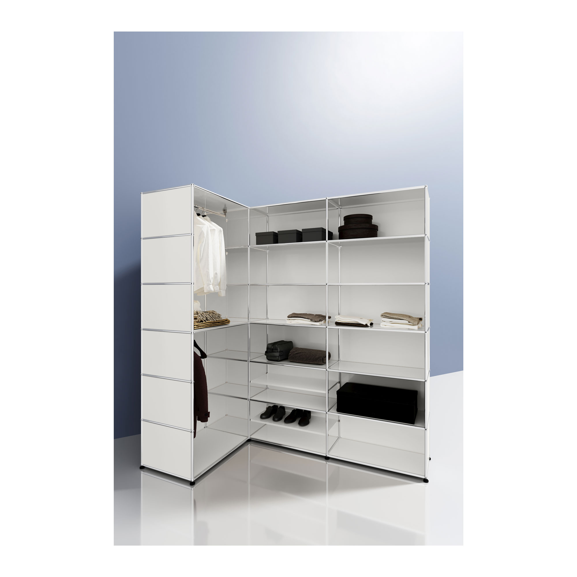 Discover the beauty of bedroom storage that’s perfectly tailored to your style and needs. Use colour combinations to add a new stylistic dimension to your bedroom or match existing decor – or select pieces in pure white or black for elegant minimalism. Make the most of in-built lighting elements to throw your clothing into crisp relief or provide the room with a subtle background glow. You can even use the USM Haller system to build a complete storage system for your walk-in wardrobe. Take a look at some of our favourite and most creative wardrobe designs, from minimalist freestanding drawer/ clothing rail combinations to elaborate statement pieces with extensive storage room for all of your clothing and all sorts of other treasures and keepsakes.